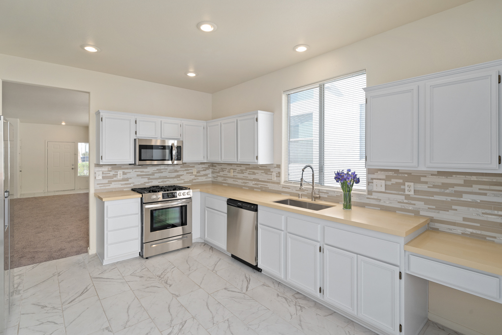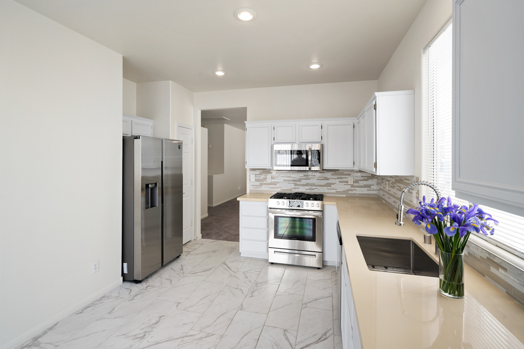 Completely remodeled charming single story home with an open great room concept. Beautiful kitchen features new stainless steel appliances overlooking the oversized backyard. Master bathroom with double-sink vanity. Upgraded carpet and tile flooring. Fresh white paint throughout the property, brand new appliances including stove, fridge, dishwasher, and microwave. Painted kitchen & bathroom cabinets, quartz countertops in bathrooms & kitchen and glass tile backsplash. New sink faucets throughout the house, new light fixtures. The entire backyard has new desert landscape with rocks. Don't miss out on this lovely home!
