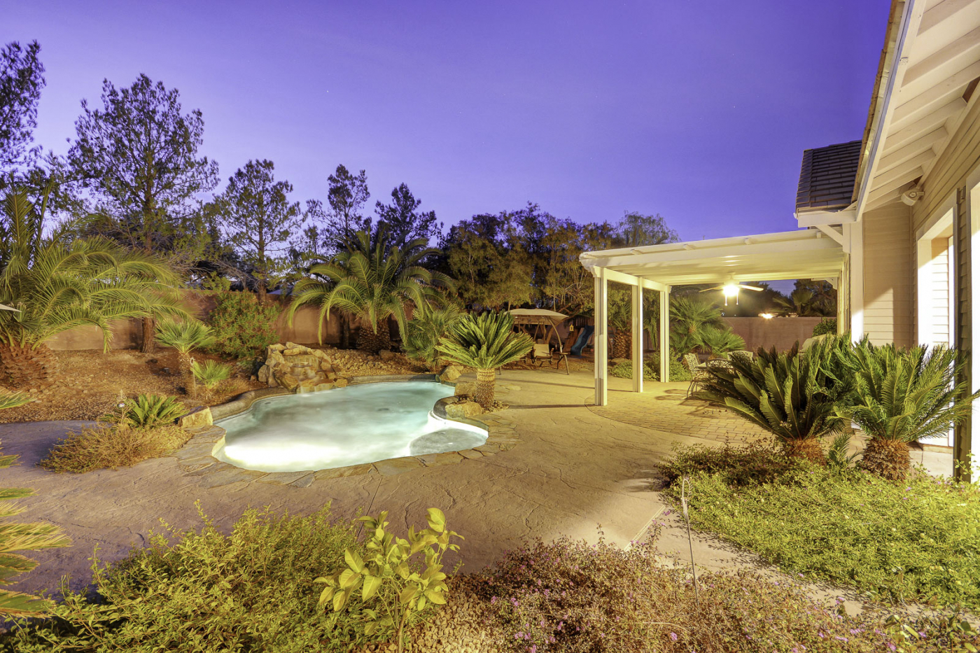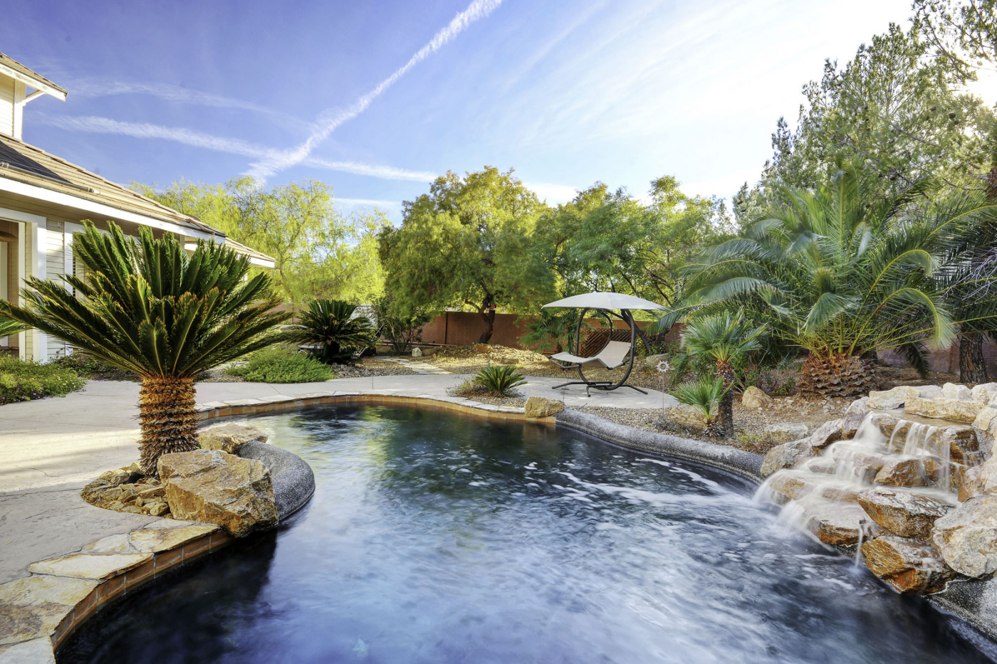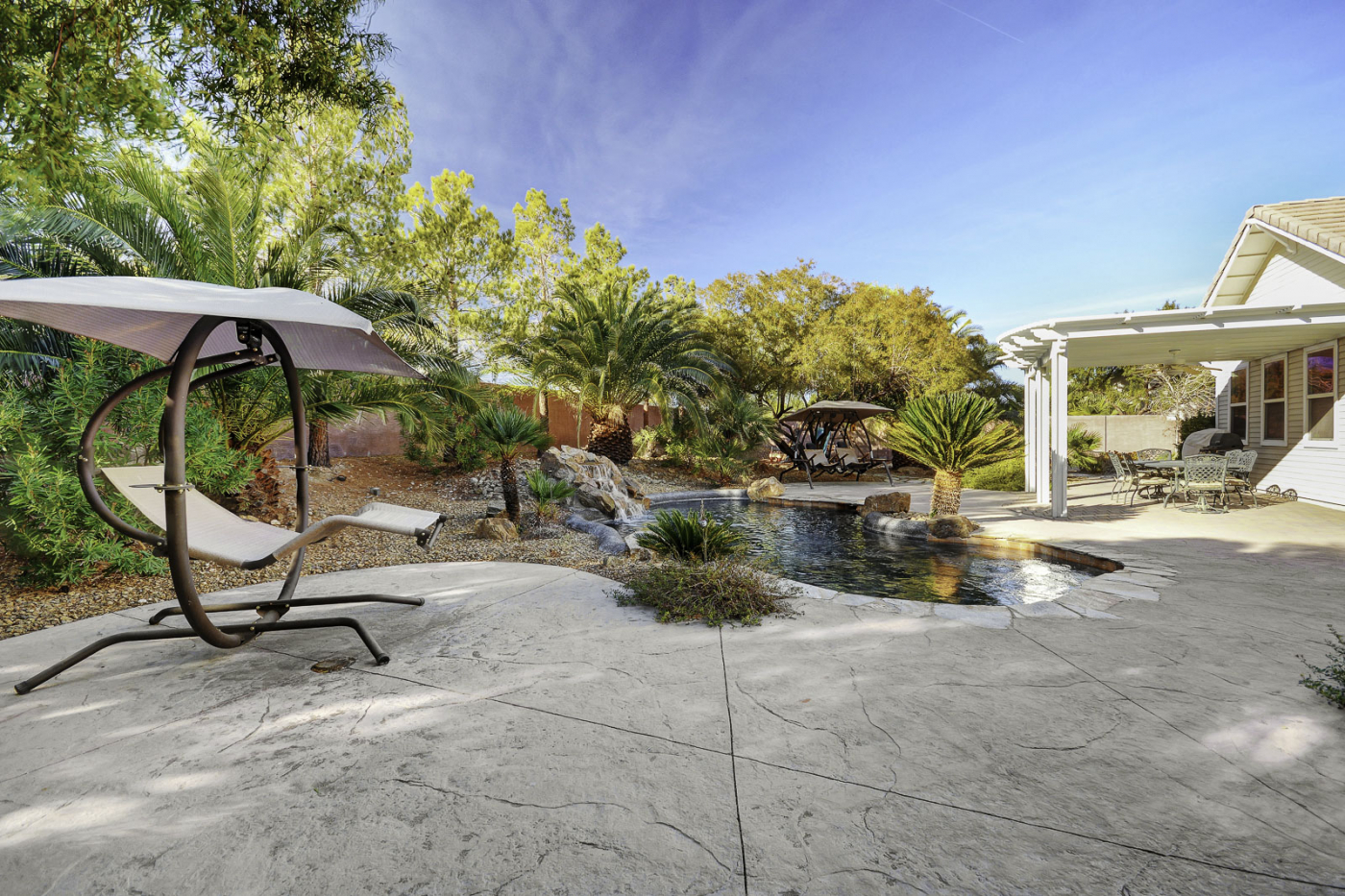 A timeless classic, this impressive five bedroom custom home is the perfect pairing of traditional design and resort style living. With a luxuriant backyard sanctuary, this home is sure to feel like a true paradise. Half an acre of vibrant landscaping frames a glistening waterfall pouring into a solar heated pool and spa. This property also showcases a spacious side yard with RV/boat accommodations. Incredibly priced, this estate caters to your every need with fully owned solar panels for a next to nothing power bill. Inside, enjoy high ceilings, a gourmet chef's kitchen, and 5 en-suite bedrooms with a 1st floor master retreat. Additional features include a covered patio wired for sound, 2 fireplaces, hardwood floors, 3 car garage with built-ins, & ample storage throughout. This private gated community is just minutes from strip and hosts breathtaking mountain vistas.