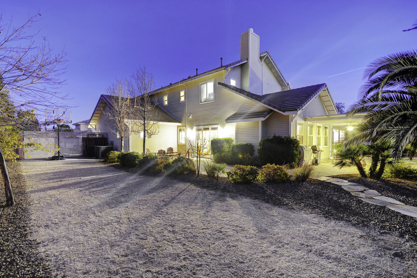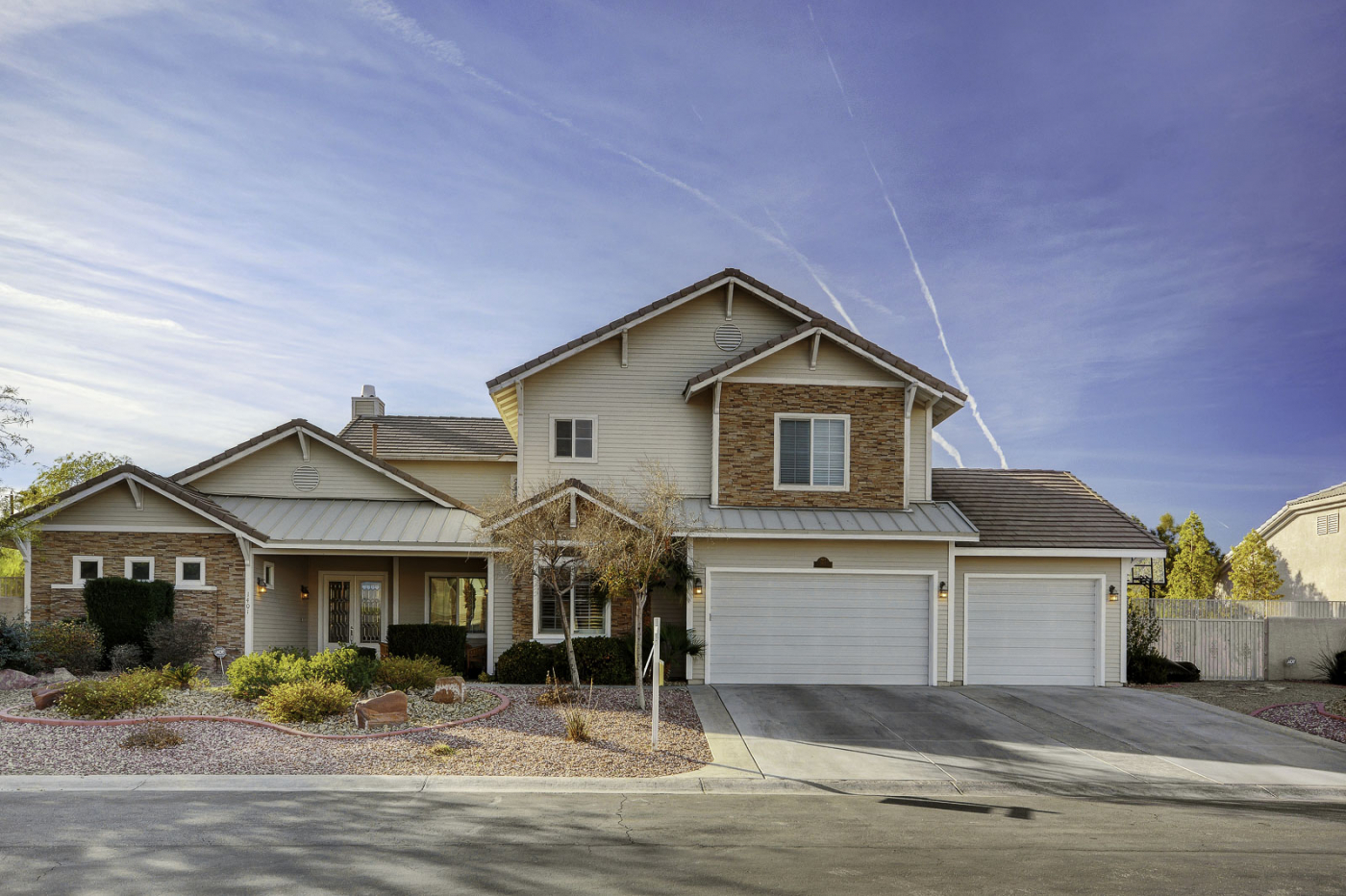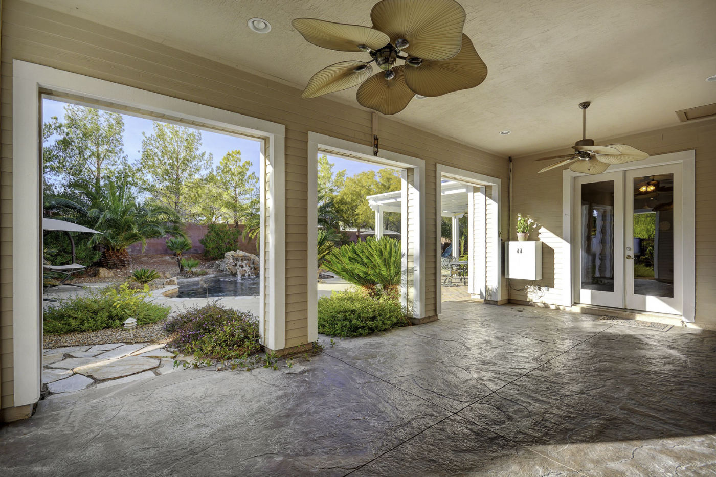 A timeless classic, this impressive five bedroom custom home is the perfect pairing of traditional design and resort style living. With a luxuriant backyard sanctuary, this home is sure to feel like a true paradise. Half an acre of vibrant landscaping frames a glistening waterfall pouring into a solar heated pool and spa. This property also showcases a spacious side yard with RV/boat accommodations. Incredibly priced, this estate caters to your every need with fully owned solar panels for a next to nothing power bill. Inside, enjoy high ceilings, a gourmet chef's kitchen, and 5 en-suite bedrooms with a 1st floor master retreat. Additional features include a covered patio wired for sound, 2 fireplaces, hardwood floors, 3 car garage with built-ins, & ample storage throughout. This private gated community is just minutes from strip and hosts breathtaking mountain vistas.